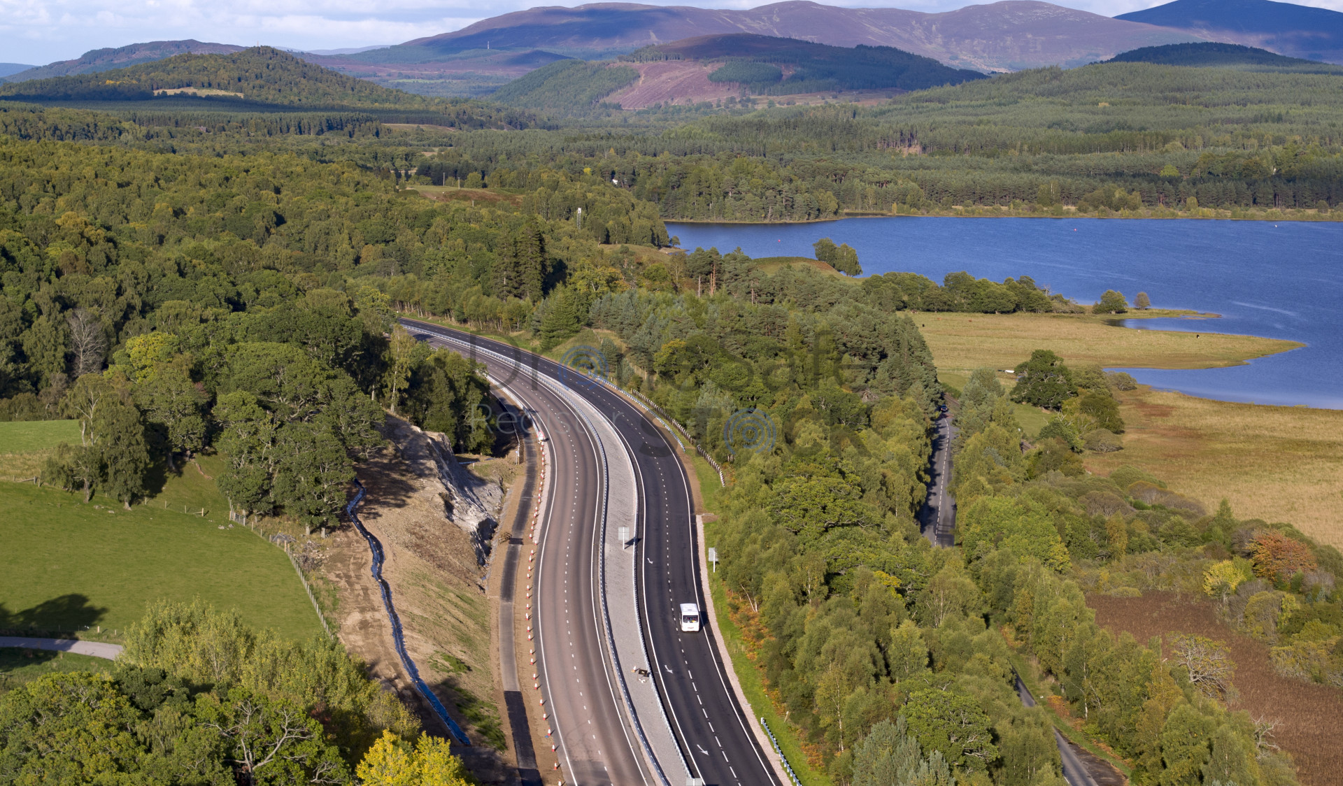 A9 road and Loch Insh Cairngorms National Park aerial image
