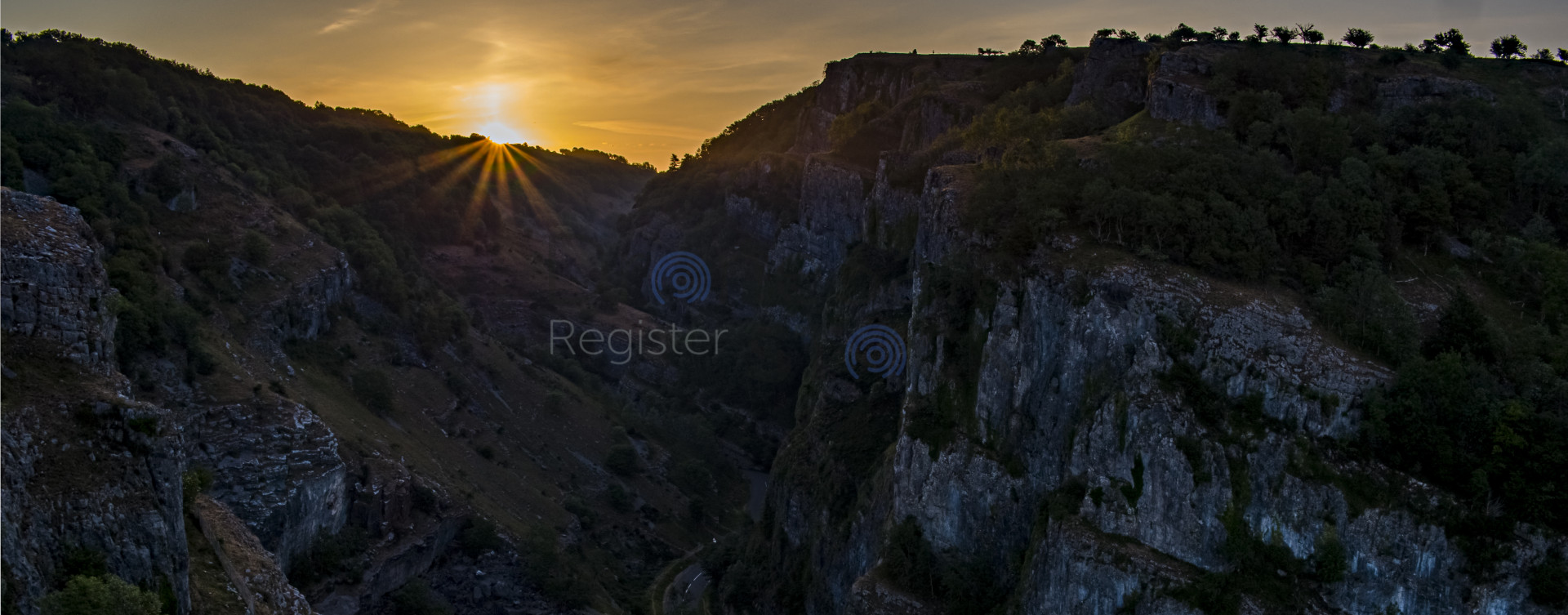 A view up Cheddar Gorge with the sun peeping over the horizon in 2.44:1 5.2k