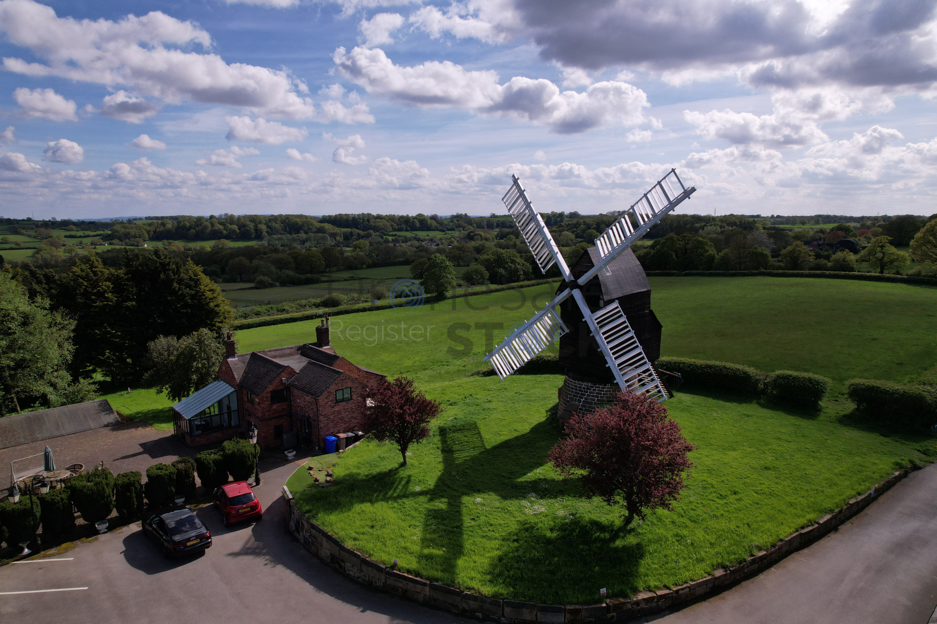 View of the Cat and Fiddle windmill with cloudy skies and sunny views