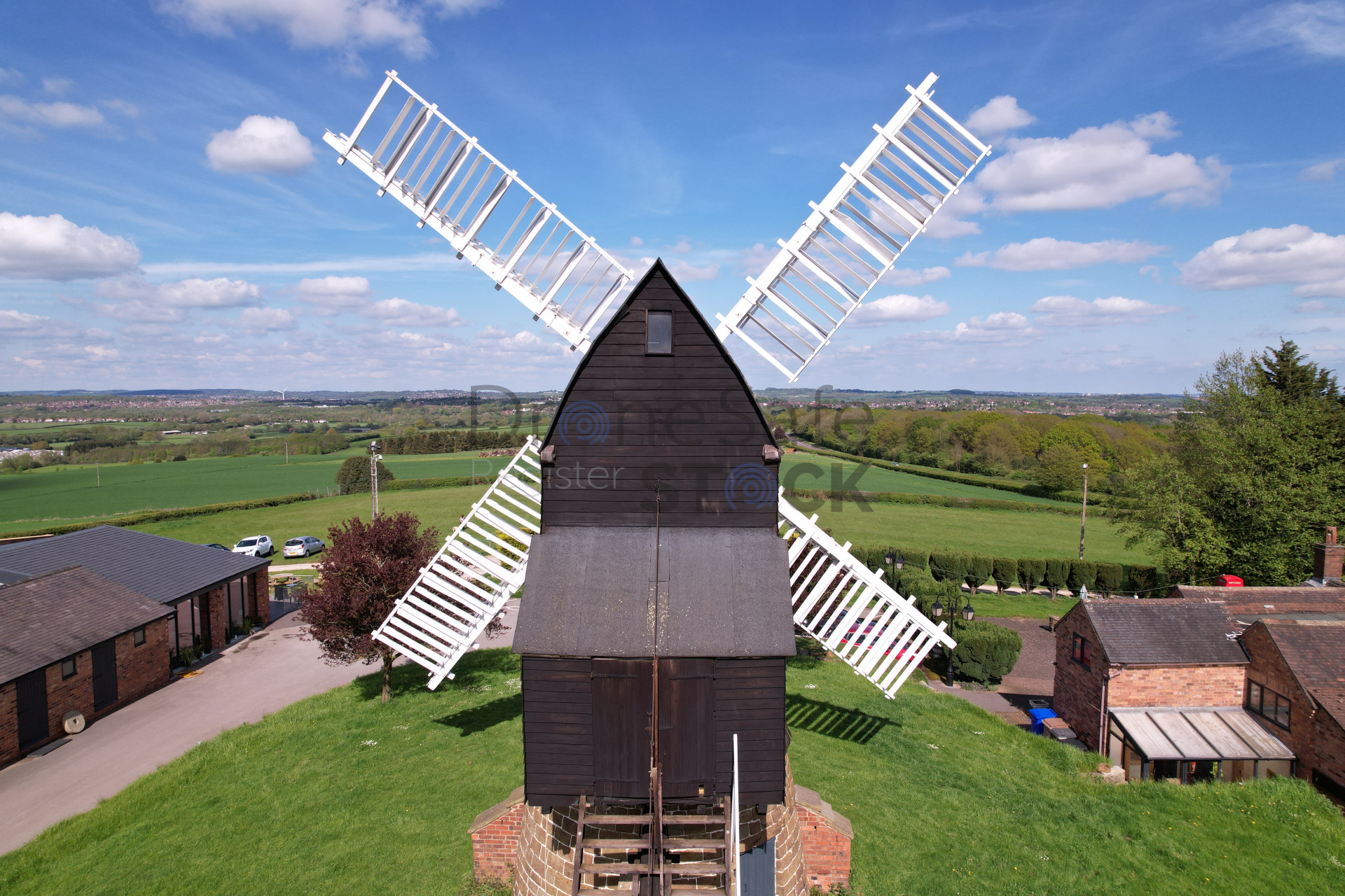 View from behind the Cat and Fiddle windmill looking through vanes towards cloudy skies and sunny views