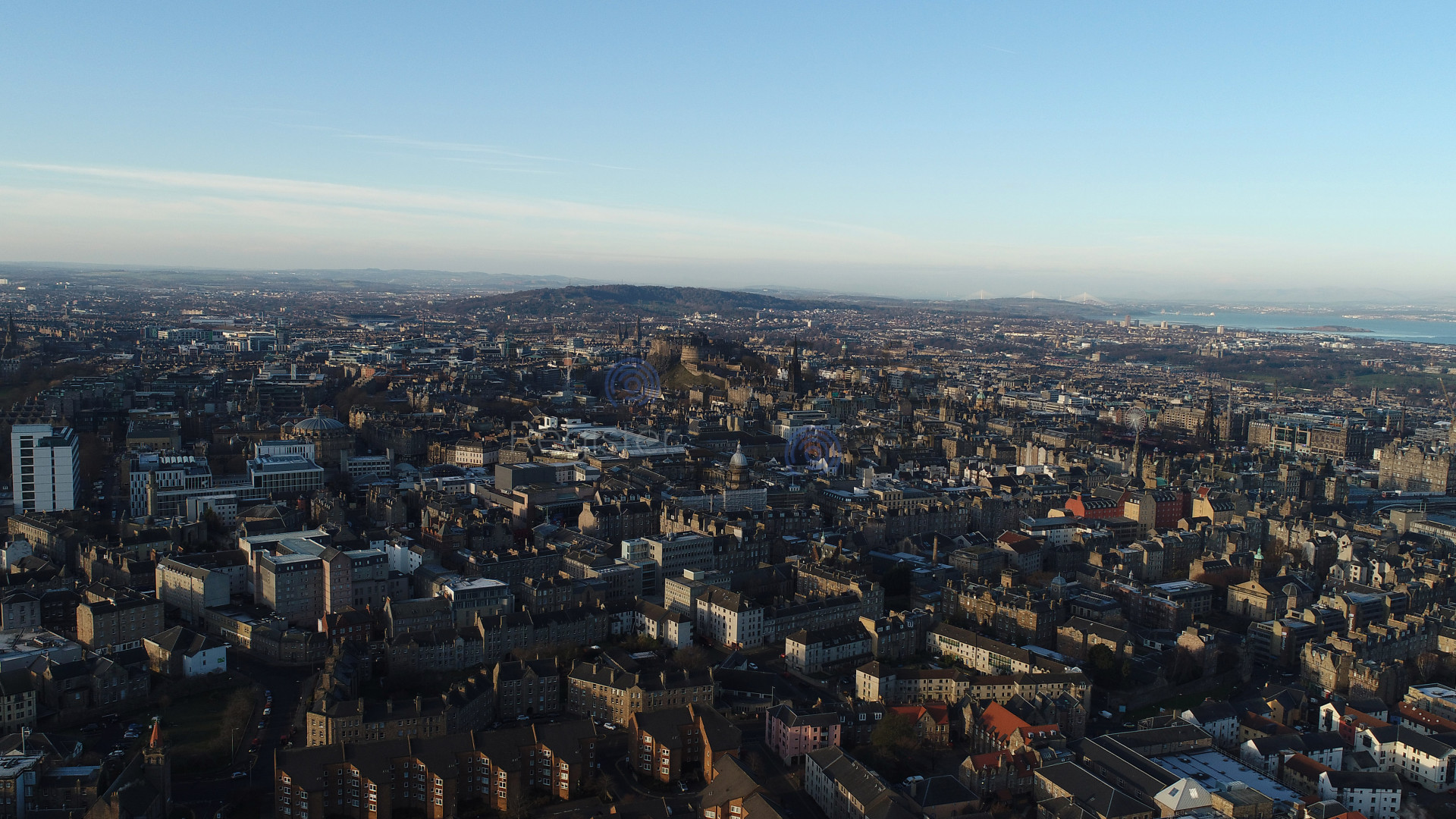 An aerial scene of Edinburgh with the castle in the distance in December 2018