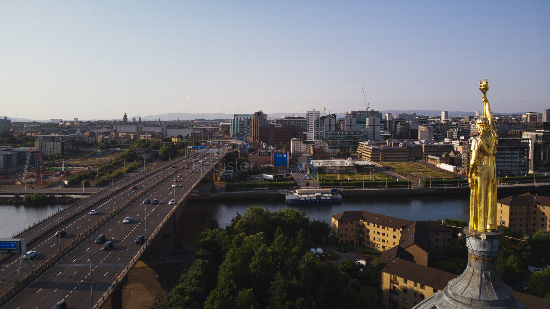 Golden Statue overlooking Motorway bridge Glasgow