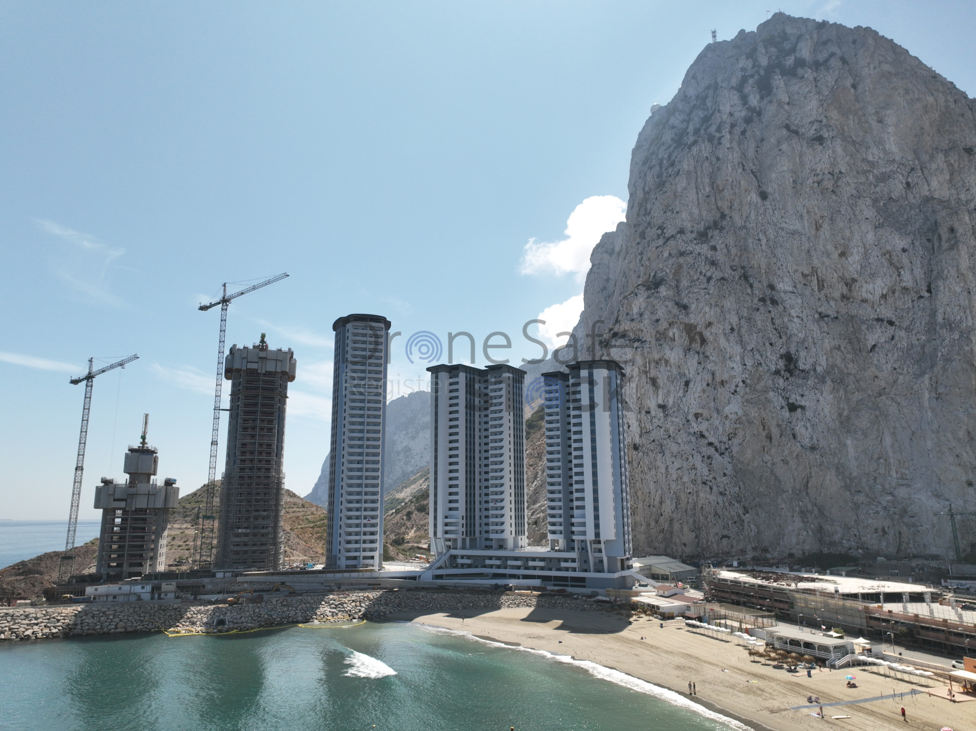 Hassan Centenary Terraces Gibraltar. new development and construction. Eastern Beach and Gibraltar Runway. British Territory. Drone Aerial Photography. Devils Tower road.