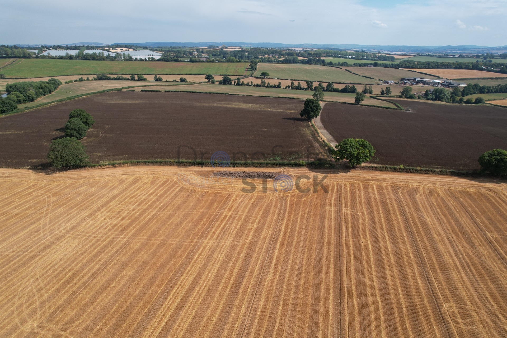 Aerial view of harvested wheat fields and some cultivated fields beyond