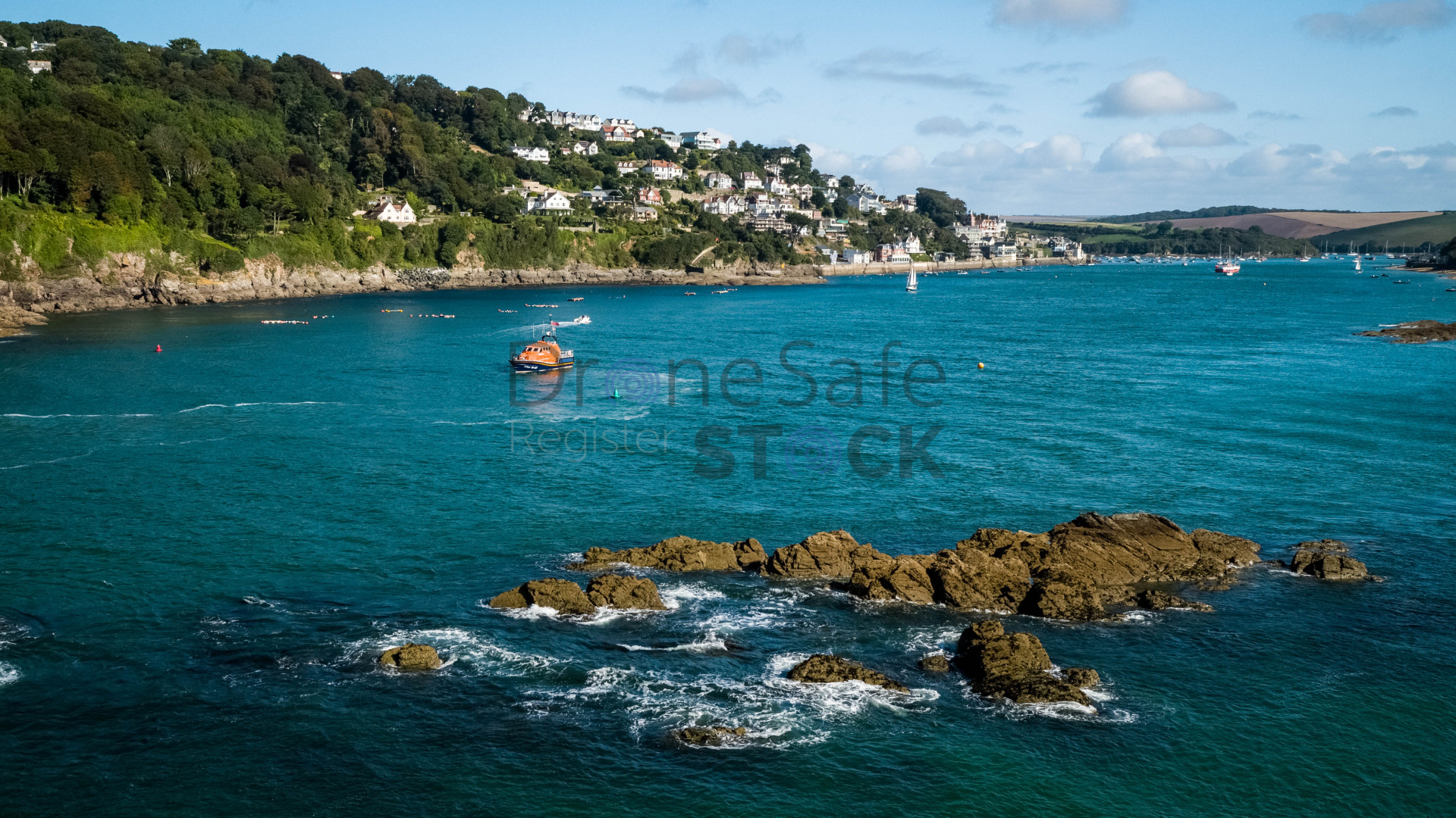A relatively low aerial of the Salcombe lifeboat lining up for a full speed run out of the harbour for training