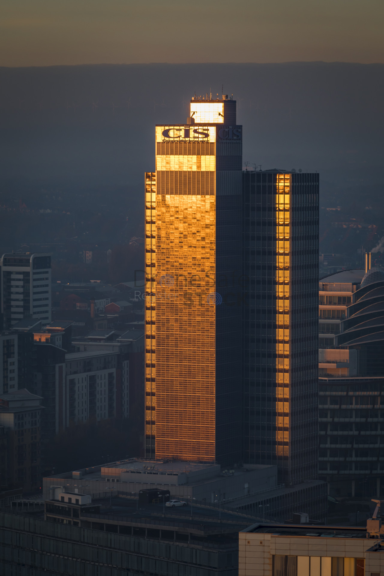 Setting sun reflecting of the CIS Building in Manchester